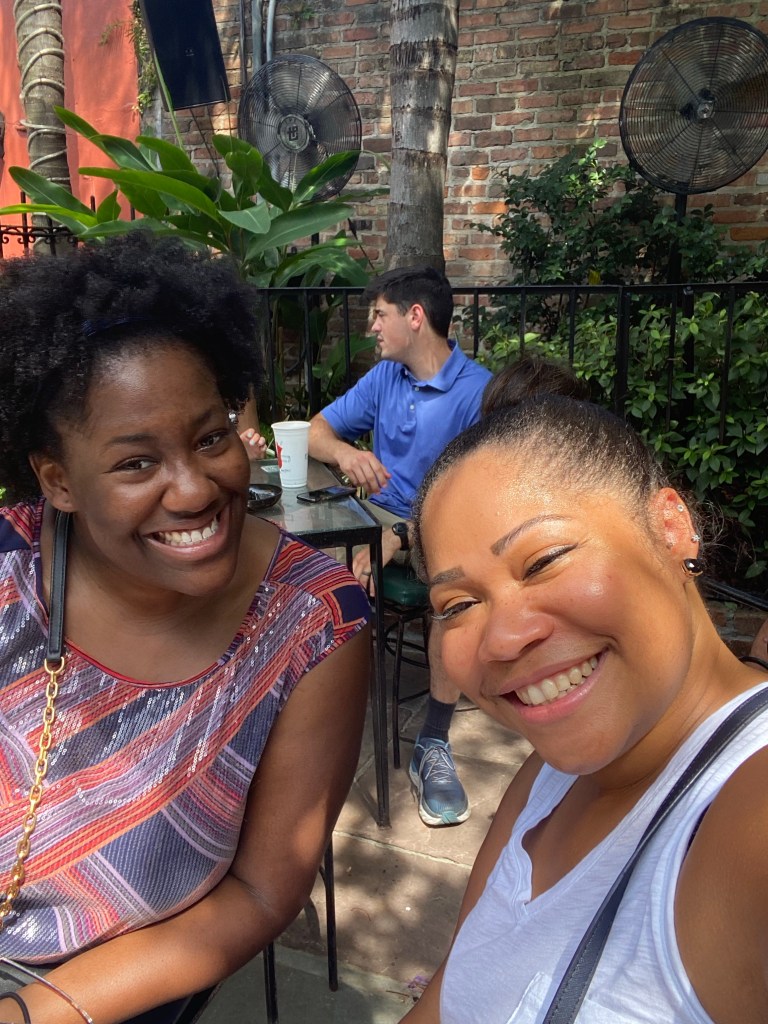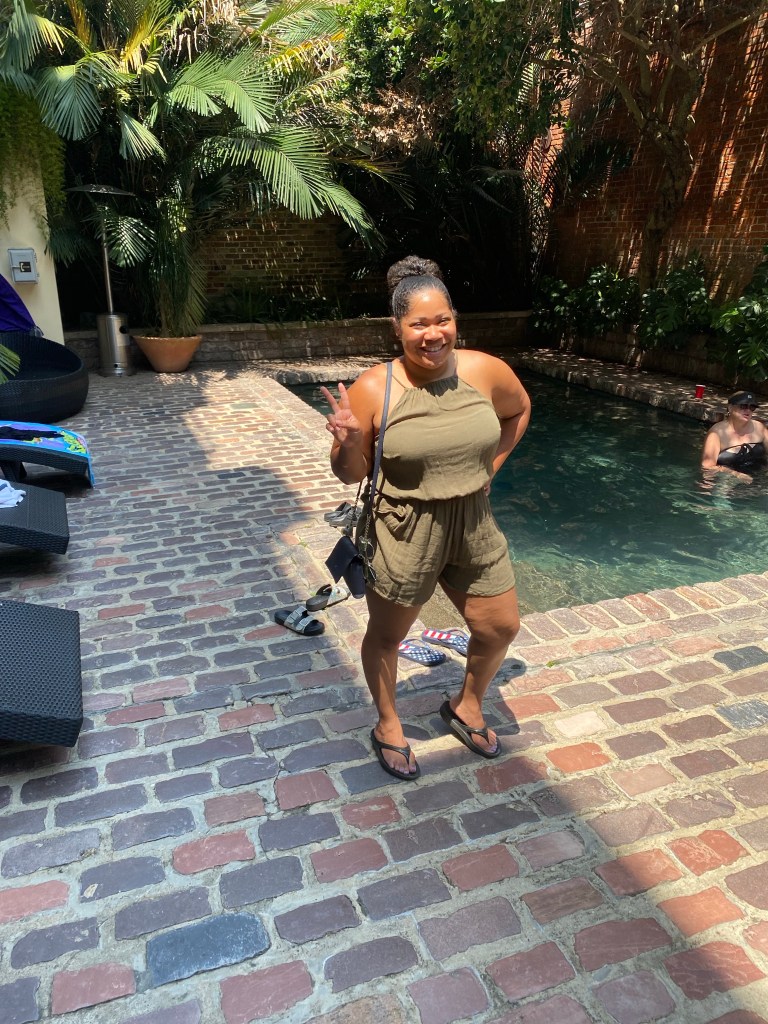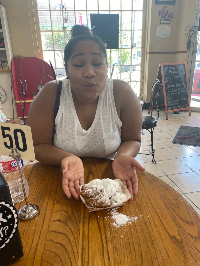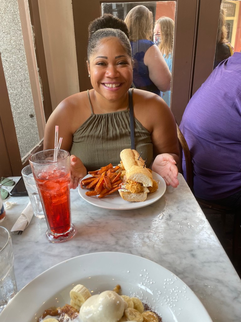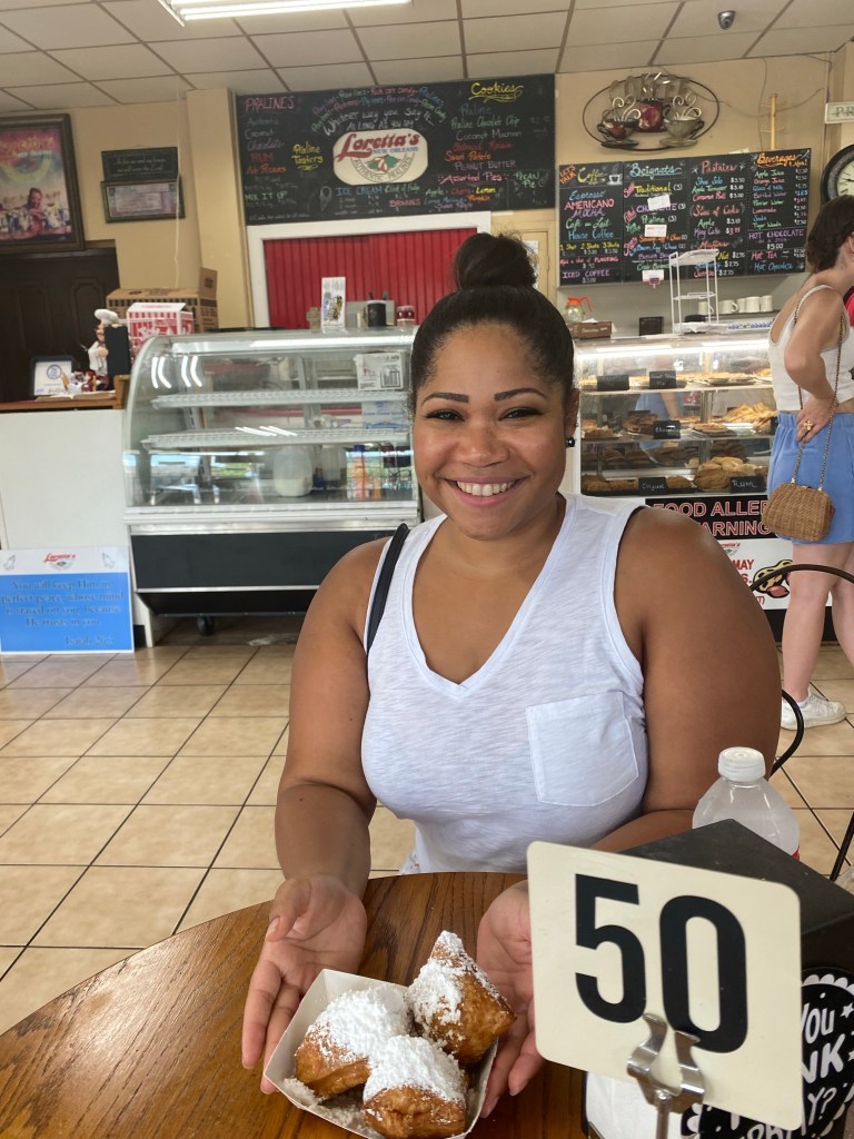 Today was our final day in Nola… We decided to go walk around the town a little bit more. We walked to Jackson square and watched a magic show. Can I say that guy came ready to perform and get money… He had a Cash App and a Venmo ready and available just in case people didn’t carry cash! We had a nice brunch at Stanley! I didn’t want to leave without trying a Poboy… So I got the shrimp Poboy with sweet potato fries. I was kind of bummed that we didn’t have a chance to get in the pool at our hotel… We had a really nice hotel with a really nice outside patio– but we just stayed so busy the entire time but we quickly grabbed a few shots by the pool before we left! I would say we made the most out of our time in New Orleans and I would definitely want to return. Trip highlight was tasting beignets at Loretta’s pralines!!