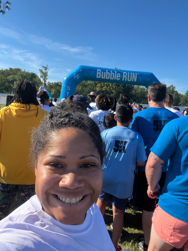 The course had four different bubble stations.. The first was pink the second was blue the third was green and the fourth was yellow! The grassy area around/under the bubble station gets very very muddy and might mess up your shoes (they will get wet) if you run/walk directly through it- I learned this from the first bubble station and chose to run around the others to avoid getting my shoes muddy and damp.